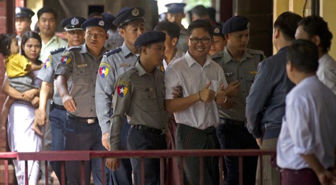 The case has drawn worldwide attention as an example of how press freedom is suffering under the government of Nobel Peace laureate Aung San Suu Kyi. A court in Myanmar court has sentenced two Reuters journalists to seven years in prison for illegal possession of official documents while reporting on violence against Rohingya Muslims. Wa Lone, 32, and Kyaw Soe Oo, 28, had pleaded not guilty to violating the colonial-era Official Secrets Act, which carries a maximum sentence of 14 years. In his ruling, judge Ye Lwin said the men “tried…